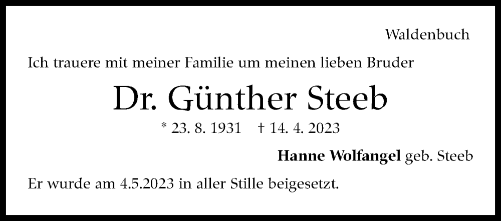 Hier finden Sie alle Traueranzeigen aus der Zeitung, die bisher für Günther Steeb erschienen sind. Weitere Traueranzeigen, die in der Zeitung erscheinen, werden hier ebenfalls aufgelistet