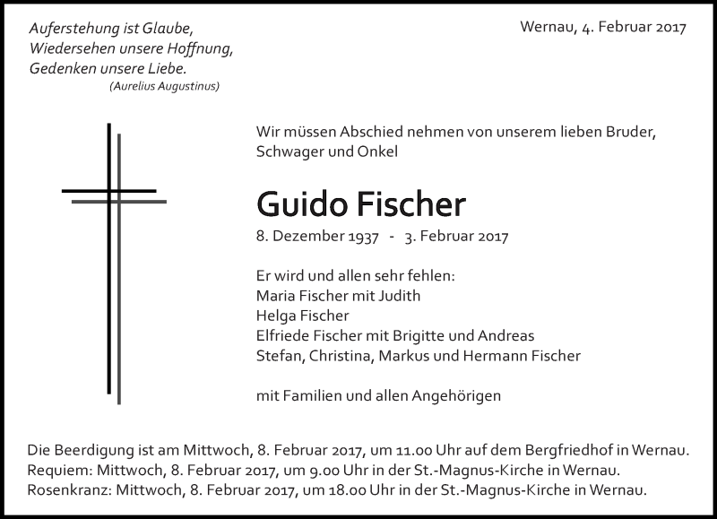 Hier finden Sie alle Traueranzeigen aus der Zeitung, die bisher für Guido Fischer erschienen sind. Weitere Traueranzeigen, die in der Zeitung erscheinen, werden hier ebenfalls aufgelistet