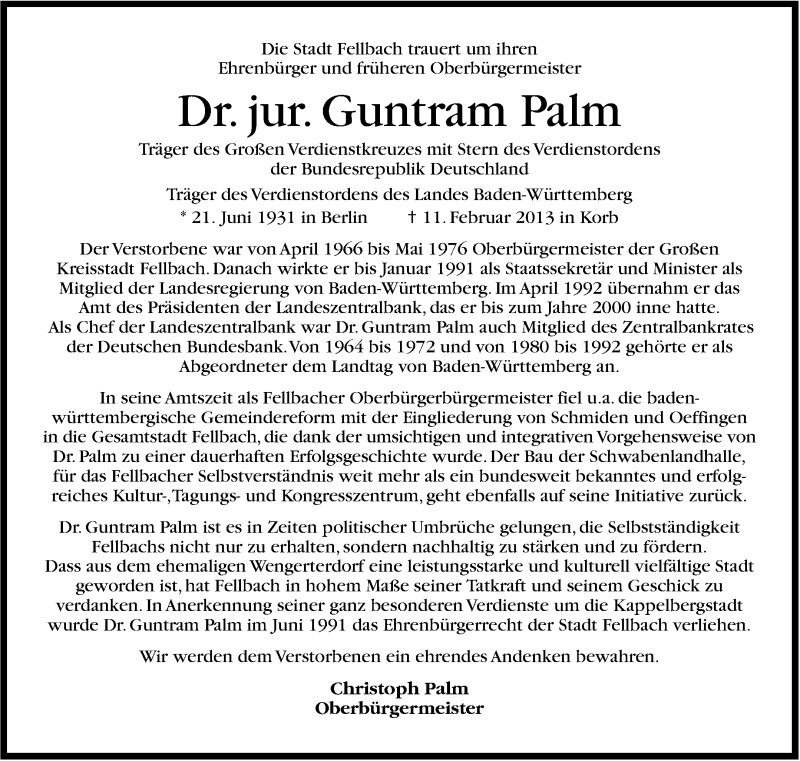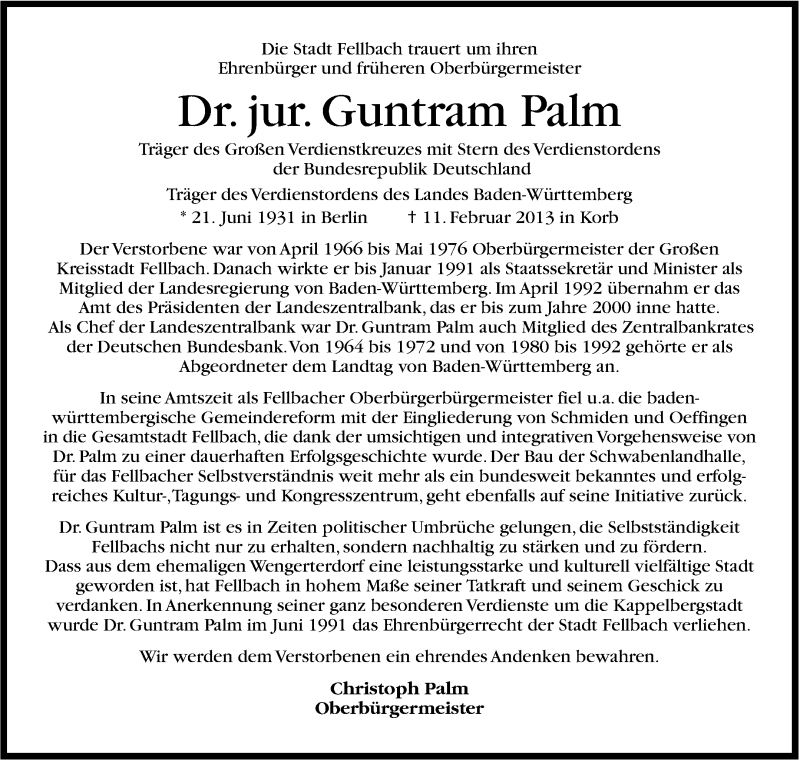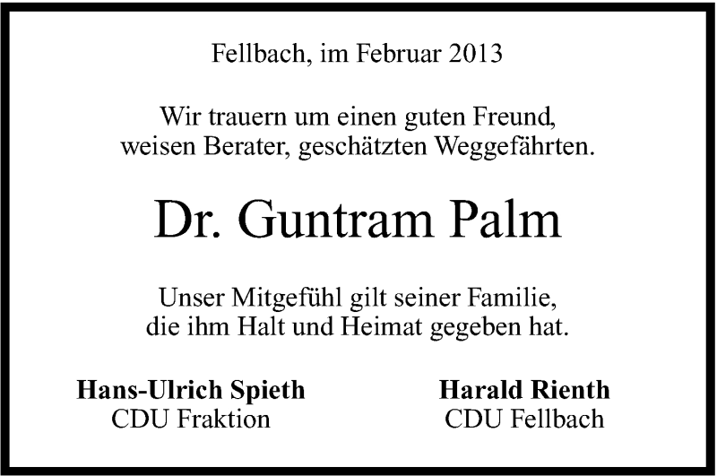 Hier finden Sie alle Traueranzeigen aus der Zeitung, die bisher für Guntram Palm erschienen sind. Weitere Traueranzeigen, die in der Zeitung erscheinen, werden hier ebenfalls aufgelistet