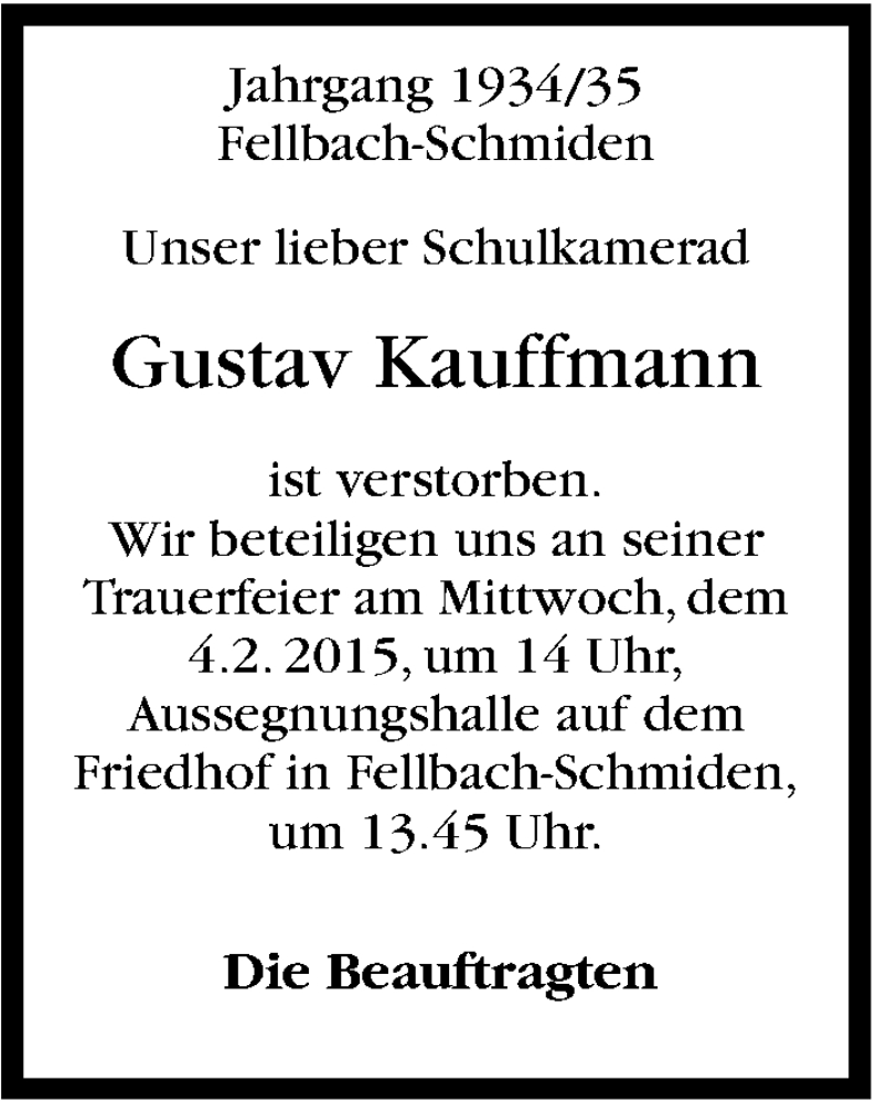 Hier finden Sie alle Traueranzeigen aus der Zeitung, die bisher für Gustav Kauffmann erschienen sind. Weitere Traueranzeigen, die in der Zeitung erscheinen, werden hier ebenfalls aufgelistet