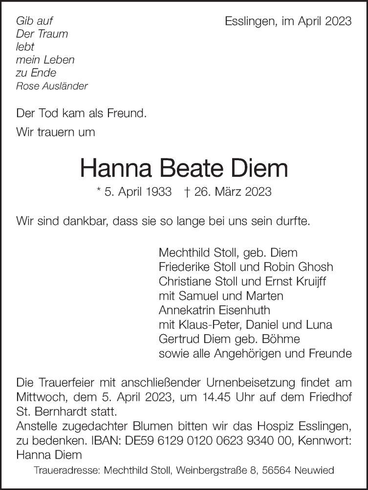 Hier finden Sie alle Traueranzeigen aus der Zeitung, die bisher für Hanna Beate Diem erschienen sind. Weitere Traueranzeigen, die in der Zeitung erscheinen, werden hier ebenfalls aufgelistet