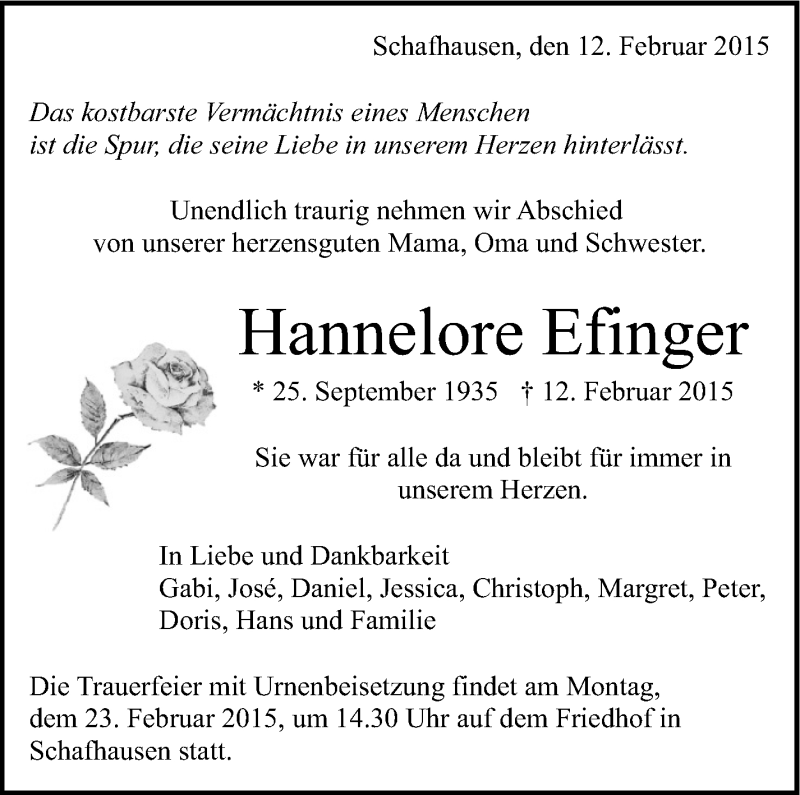 Hier finden Sie alle Traueranzeigen aus der Zeitung, die bisher für Hannelore Efinger erschienen sind. Weitere Traueranzeigen, die in der Zeitung erscheinen, werden hier ebenfalls aufgelistet