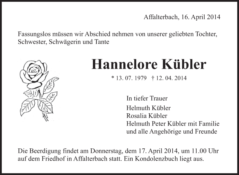 Hier finden Sie alle Traueranzeigen aus der Zeitung, die bisher für Hannelore Kübler erschienen sind. Weitere Traueranzeigen, die in der Zeitung erscheinen, werden hier ebenfalls aufgelistet