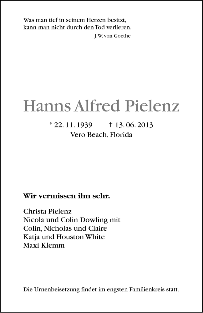 Hier finden Sie alle Traueranzeigen aus der Zeitung, die bisher für Hanns Alfred Pielenz erschienen sind. Weitere Traueranzeigen, die in der Zeitung erscheinen, werden hier ebenfalls aufgelistet