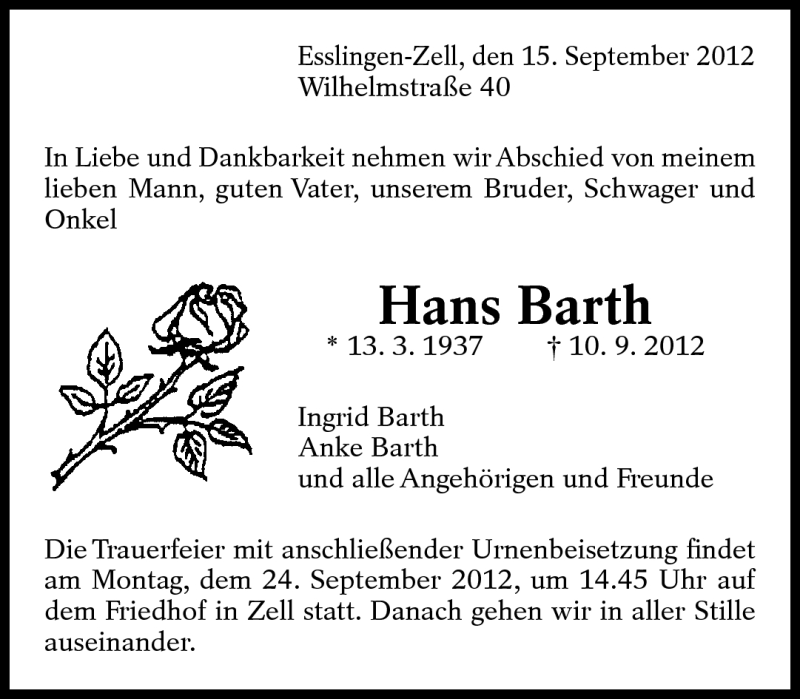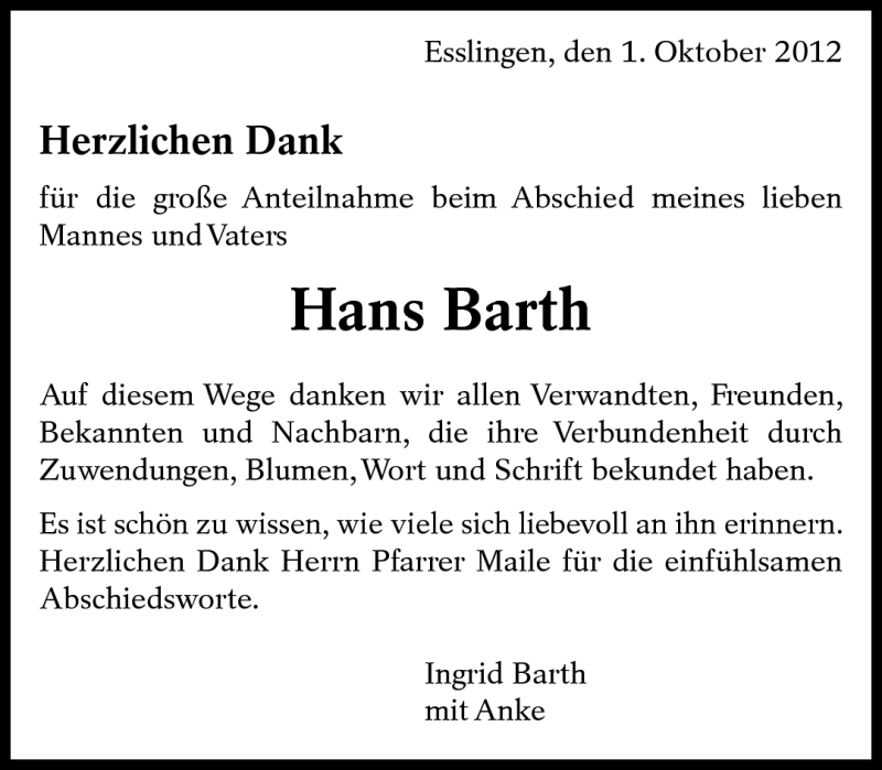 Hier finden Sie alle Traueranzeigen aus der Zeitung, die bisher für Hans Barth erschienen sind. Weitere Traueranzeigen, die in der Zeitung erscheinen, werden hier ebenfalls aufgelistet