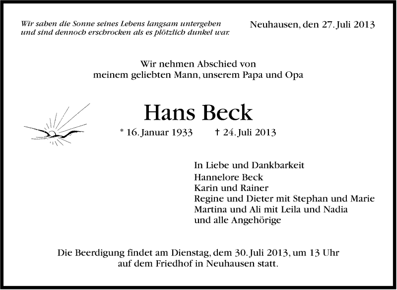 Hier finden Sie alle Traueranzeigen aus der Zeitung, die bisher für Hans Beck erschienen sind. Weitere Traueranzeigen, die in der Zeitung erscheinen, werden hier ebenfalls aufgelistet