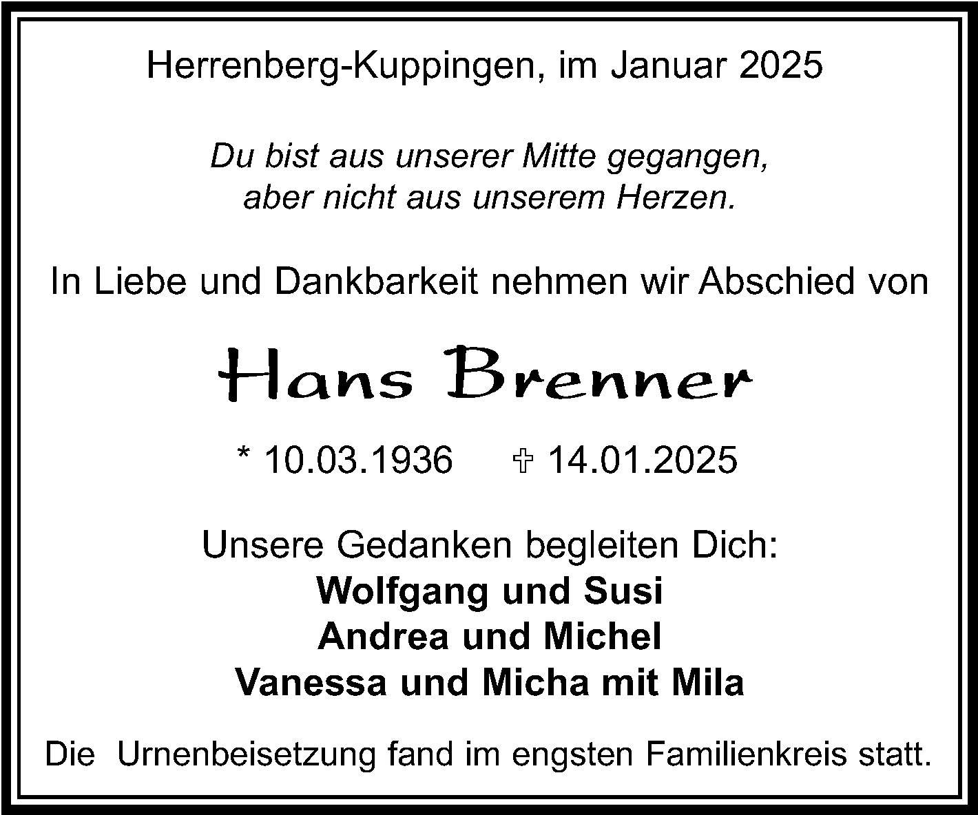Hier finden Sie alle Traueranzeigen aus der Zeitung, die bisher für Hans Brenner erschienen sind. Weitere Traueranzeigen, die in der Zeitung erscheinen, werden hier ebenfalls aufgelistet