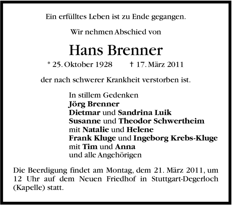 Hier finden Sie alle Traueranzeigen aus der Zeitung, die bisher für Hans Brenner erschienen sind. Weitere Traueranzeigen, die in der Zeitung erscheinen, werden hier ebenfalls aufgelistet