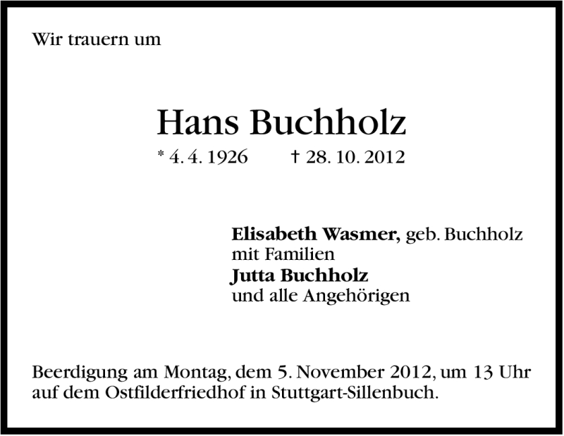 Hier finden Sie alle Traueranzeigen aus der Zeitung, die bisher für Hans Buchholz erschienen sind. Weitere Traueranzeigen, die in der Zeitung erscheinen, werden hier ebenfalls aufgelistet