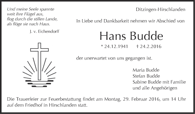 Hier finden Sie alle Traueranzeigen aus der Zeitung, die bisher für Hans Budde erschienen sind. Weitere Traueranzeigen, die in der Zeitung erscheinen, werden hier ebenfalls aufgelistet