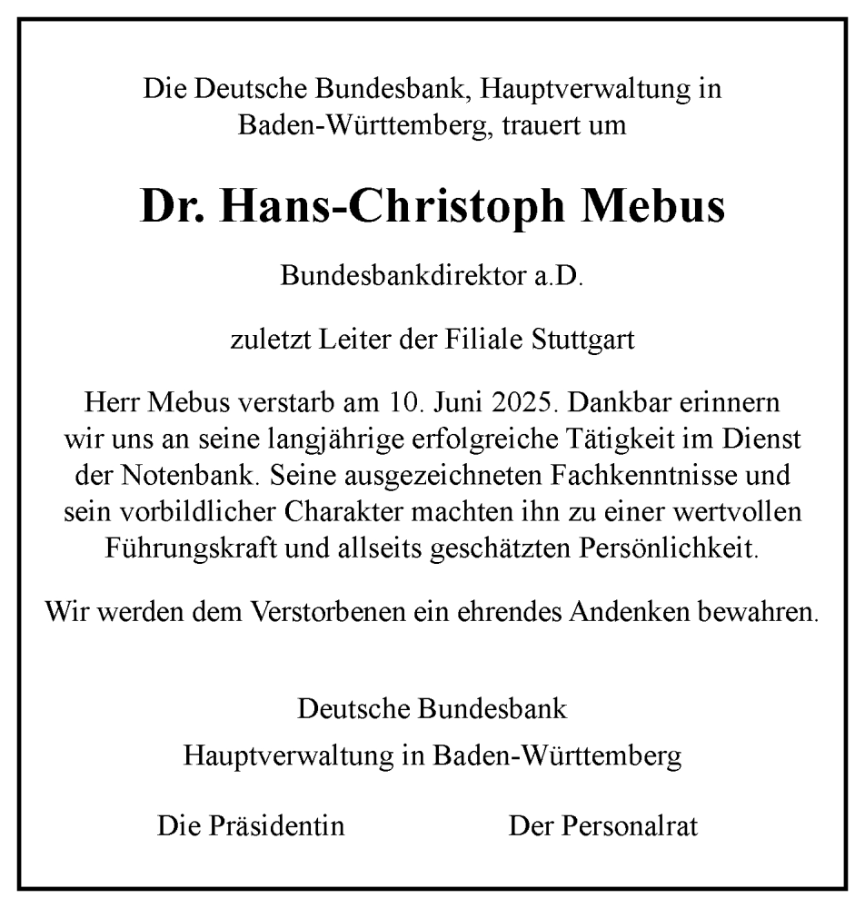 Hier finden Sie alle Traueranzeigen aus der Zeitung, die bisher für Hans-Christoph Mebus erschienen sind. Weitere Traueranzeigen, die in der Zeitung erscheinen, werden hier ebenfalls aufgelistet