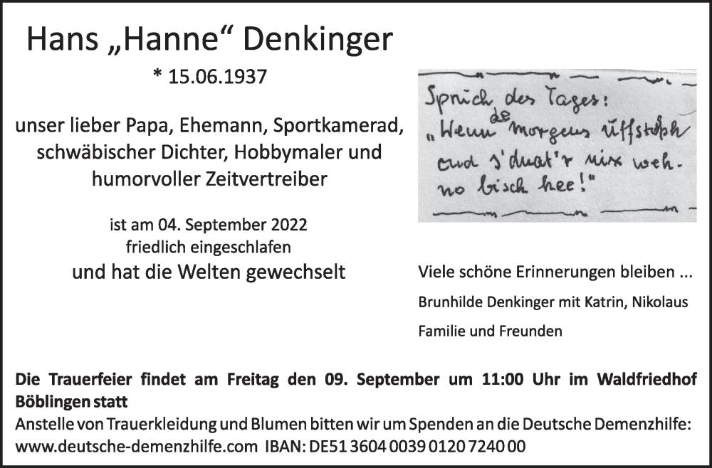 Hier finden Sie alle Traueranzeigen aus der Zeitung, die bisher für Hans Denkinger erschienen sind. Weitere Traueranzeigen, die in der Zeitung erscheinen, werden hier ebenfalls aufgelistet
