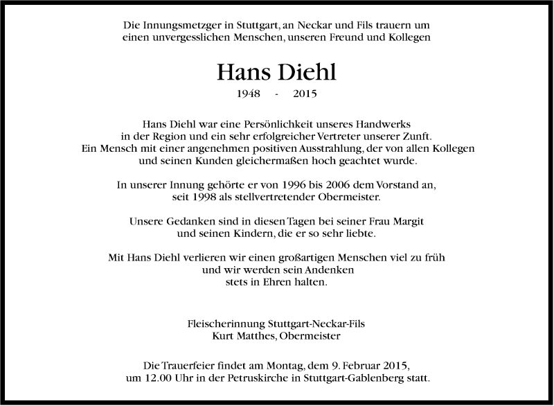 Hier finden Sie alle Traueranzeigen aus der Zeitung, die bisher für Hans Diehl erschienen sind. Weitere Traueranzeigen, die in der Zeitung erscheinen, werden hier ebenfalls aufgelistet