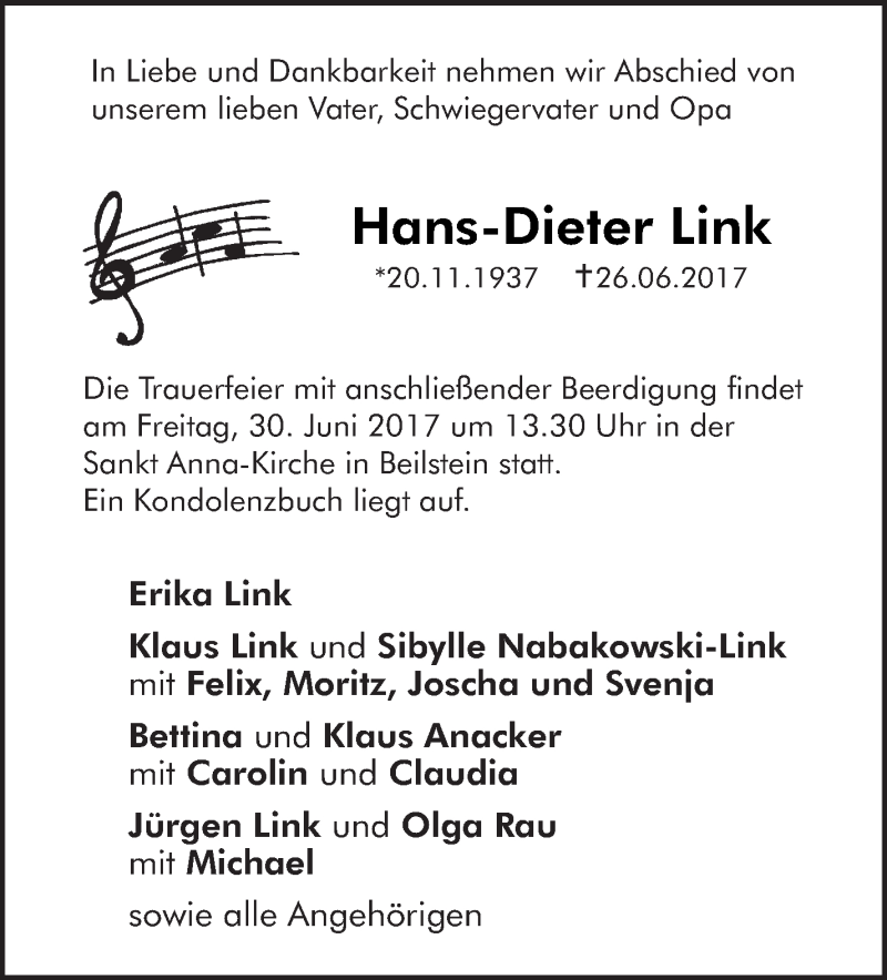Hier finden Sie alle Traueranzeigen aus der Zeitung, die bisher für Hans-Dieter Link erschienen sind. Weitere Traueranzeigen, die in der Zeitung erscheinen, werden hier ebenfalls aufgelistet