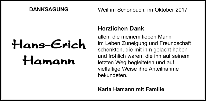 Hier finden Sie alle Traueranzeigen aus der Zeitung, die bisher für Hans-Erich Hamann erschienen sind. Weitere Traueranzeigen, die in der Zeitung erscheinen, werden hier ebenfalls aufgelistet