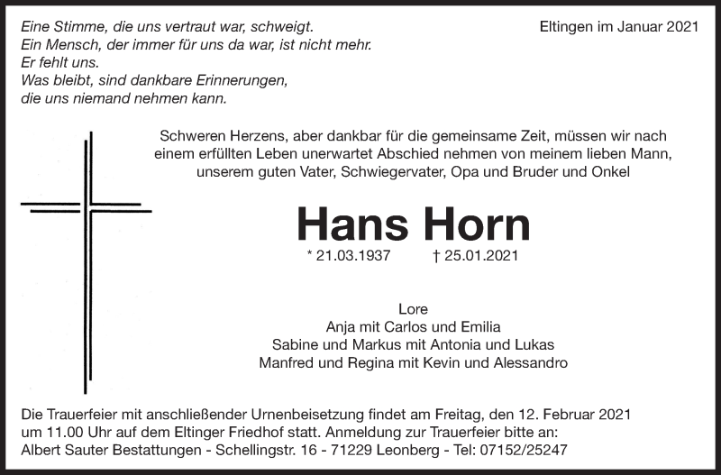 Hier finden Sie alle Traueranzeigen aus der Zeitung, die bisher für Hans Horn erschienen sind. Weitere Traueranzeigen, die in der Zeitung erscheinen, werden hier ebenfalls aufgelistet