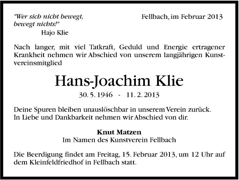 Hier finden Sie alle Traueranzeigen aus der Zeitung, die bisher für Hans-Joachim Klie erschienen sind. Weitere Traueranzeigen, die in der Zeitung erscheinen, werden hier ebenfalls aufgelistet