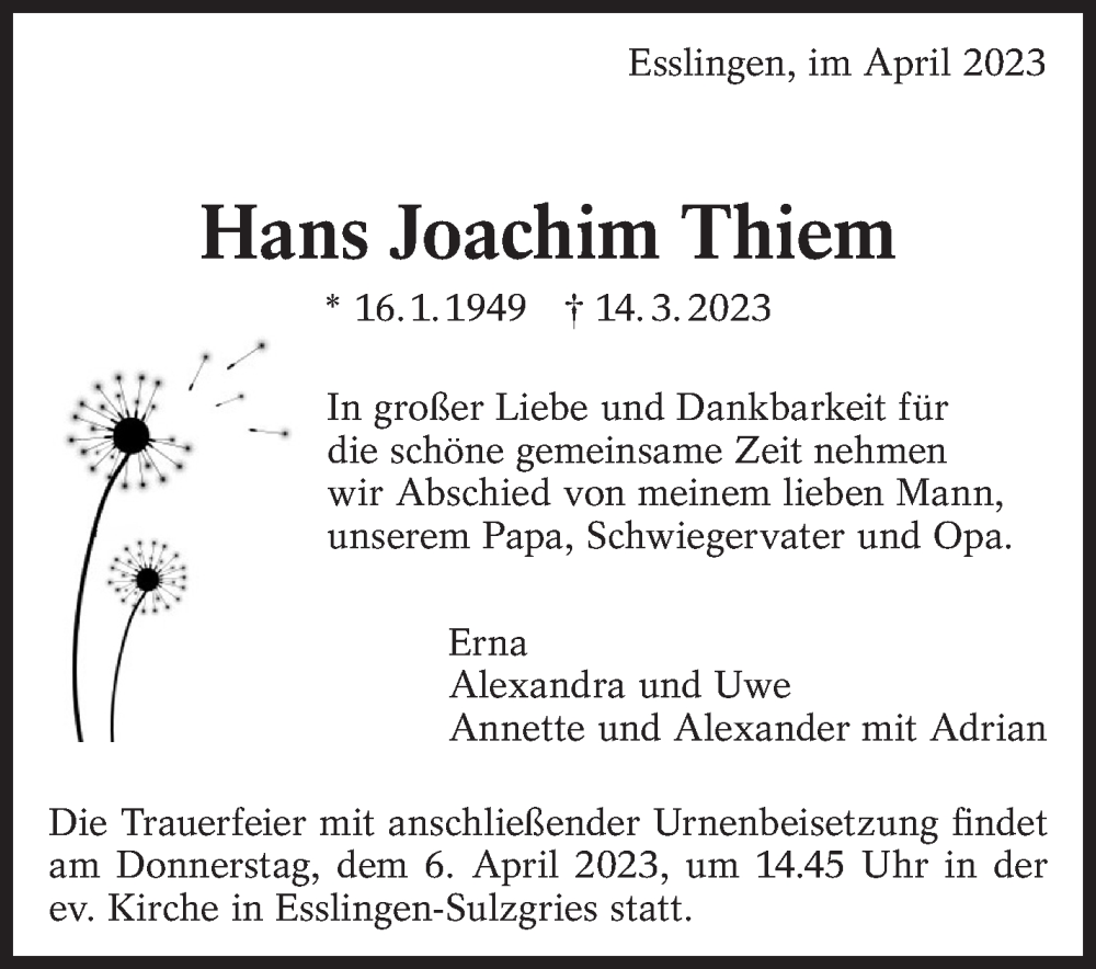 Hier finden Sie alle Traueranzeigen aus der Zeitung, die bisher für Hans Joachim Thiem erschienen sind. Weitere Traueranzeigen, die in der Zeitung erscheinen, werden hier ebenfalls aufgelistet