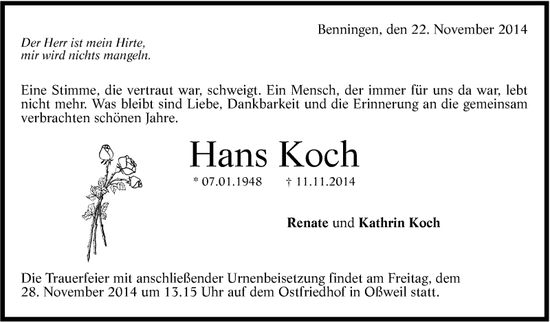 Hier finden Sie alle Traueranzeigen aus der Zeitung, die bisher für Hans Koch erschienen sind. Weitere Traueranzeigen, die in der Zeitung erscheinen, werden hier ebenfalls aufgelistet