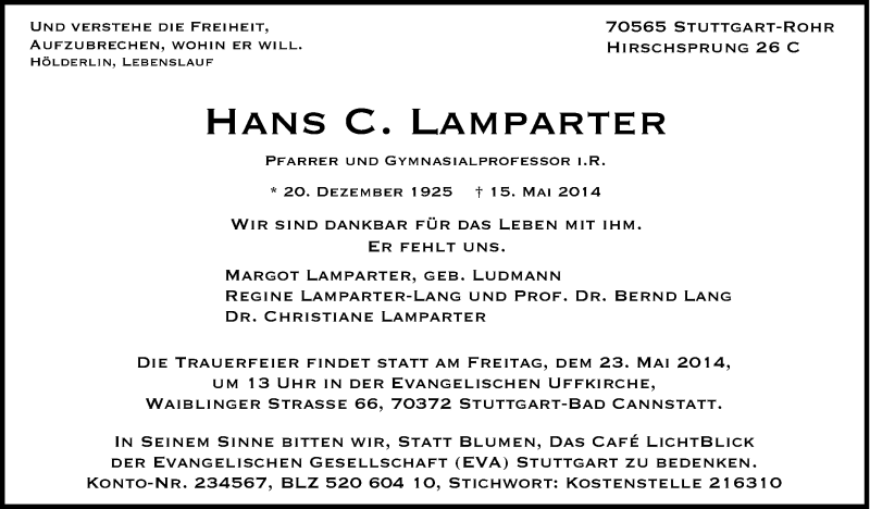 Hier finden Sie alle Traueranzeigen aus der Zeitung, die bisher für Hans Lamparter erschienen sind. Weitere Traueranzeigen, die in der Zeitung erscheinen, werden hier ebenfalls aufgelistet