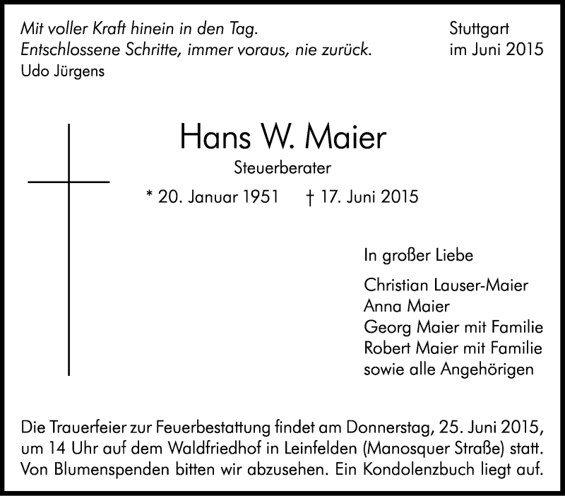 Hier finden Sie alle Traueranzeigen aus der Zeitung, die bisher für Hans Maier erschienen sind. Weitere Traueranzeigen, die in der Zeitung erscheinen, werden hier ebenfalls aufgelistet