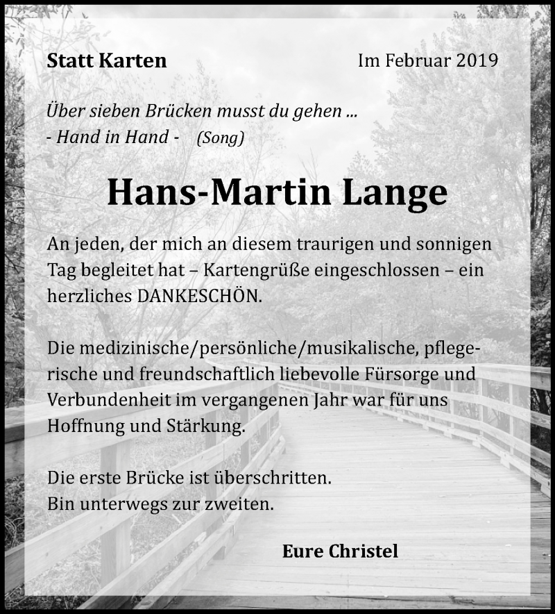 Hier finden Sie alle Traueranzeigen aus der Zeitung, die bisher für Hans-Martin Lange erschienen sind. Weitere Traueranzeigen, die in der Zeitung erscheinen, werden hier ebenfalls aufgelistet