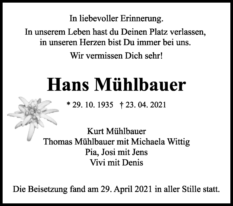 Hier finden Sie alle Traueranzeigen aus der Zeitung, die bisher für Hans Mühlbauer erschienen sind. Weitere Traueranzeigen, die in der Zeitung erscheinen, werden hier ebenfalls aufgelistet