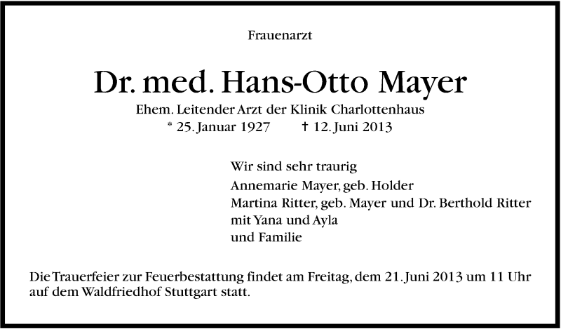 Hier finden Sie alle Traueranzeigen aus der Zeitung, die bisher für Hans-Otto Mayer erschienen sind. Weitere Traueranzeigen, die in der Zeitung erscheinen, werden hier ebenfalls aufgelistet
