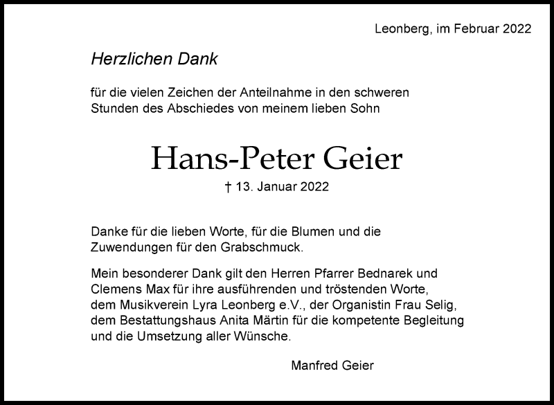 Hier finden Sie alle Traueranzeigen aus der Zeitung, die bisher für Hans-Peter Geier erschienen sind. Weitere Traueranzeigen, die in der Zeitung erscheinen, werden hier ebenfalls aufgelistet