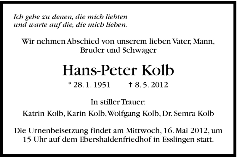 Hier finden Sie alle Traueranzeigen aus der Zeitung, die bisher für Hans-Peter Kolb erschienen sind. Weitere Traueranzeigen, die in der Zeitung erscheinen, werden hier ebenfalls aufgelistet