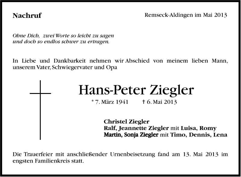 Hier finden Sie alle Traueranzeigen aus der Zeitung, die bisher für Hans-Peter Ziegler erschienen sind. Weitere Traueranzeigen, die in der Zeitung erscheinen, werden hier ebenfalls aufgelistet