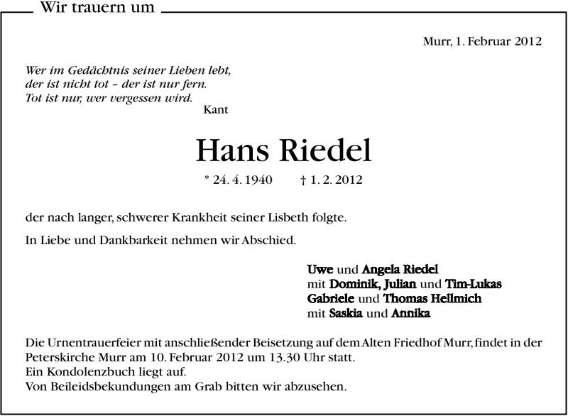 Hier finden Sie alle Traueranzeigen aus der Zeitung, die bisher für Hans Riedel erschienen sind. Weitere Traueranzeigen, die in der Zeitung erscheinen, werden hier ebenfalls aufgelistet