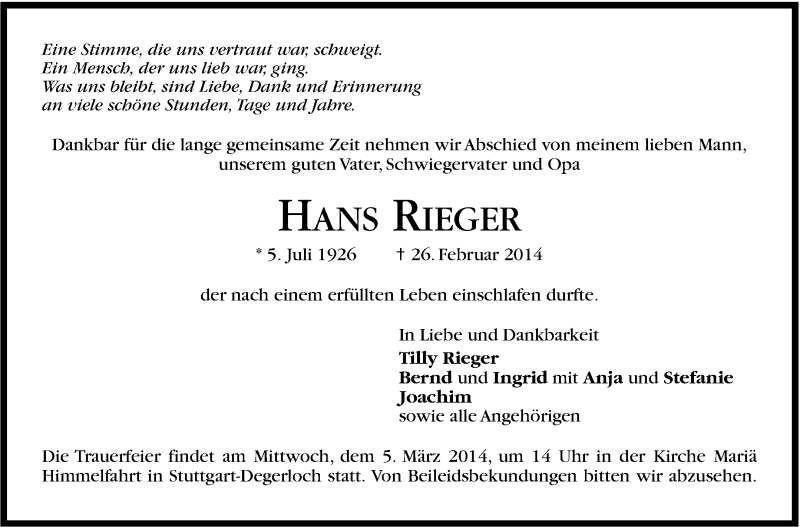 Hier finden Sie alle Traueranzeigen aus der Zeitung, die bisher für Hans Rieger erschienen sind. Weitere Traueranzeigen, die in der Zeitung erscheinen, werden hier ebenfalls aufgelistet