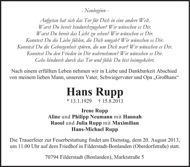Hier finden Sie alle Traueranzeigen aus der Zeitung, die bisher für Hans Rupp erschienen sind. Weitere Traueranzeigen, die in der Zeitung erscheinen, werden hier ebenfalls aufgelistet