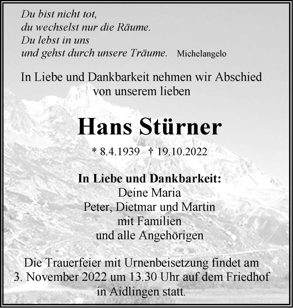 Hier finden Sie alle Traueranzeigen aus der Zeitung, die bisher für Hans Stürmer erschienen sind. Weitere Traueranzeigen, die in der Zeitung erscheinen, werden hier ebenfalls aufgelistet