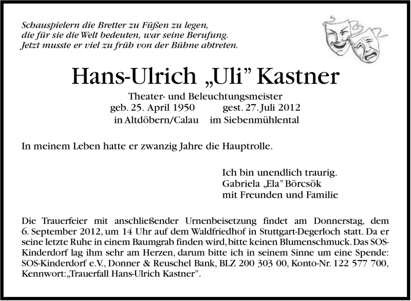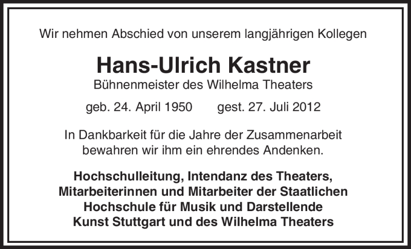Hier finden Sie alle Traueranzeigen aus der Zeitung, die bisher für Hans-Ulrich Kastner erschienen sind. Weitere Traueranzeigen, die in der Zeitung erscheinen, werden hier ebenfalls aufgelistet