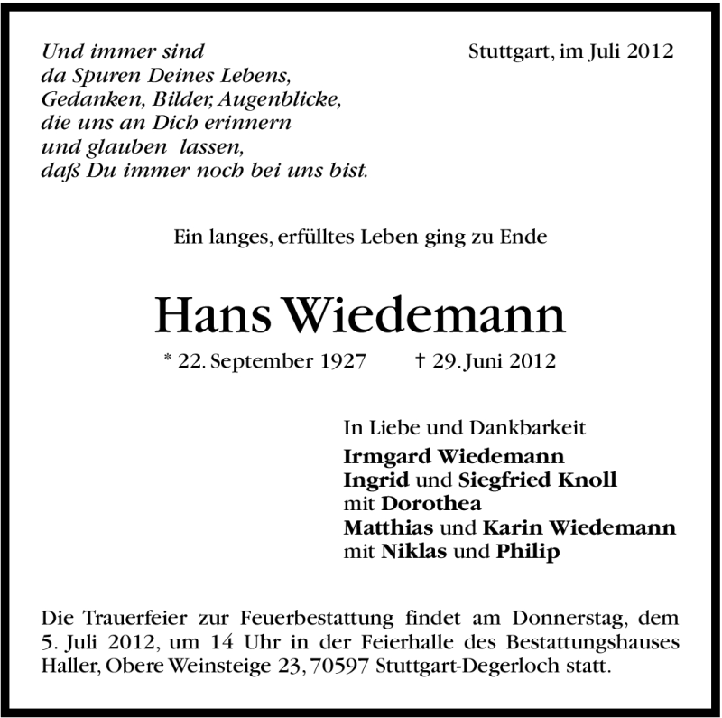 Hier finden Sie alle Traueranzeigen aus der Zeitung, die bisher für Hans Wiedemann erschienen sind. Weitere Traueranzeigen, die in der Zeitung erscheinen, werden hier ebenfalls aufgelistet