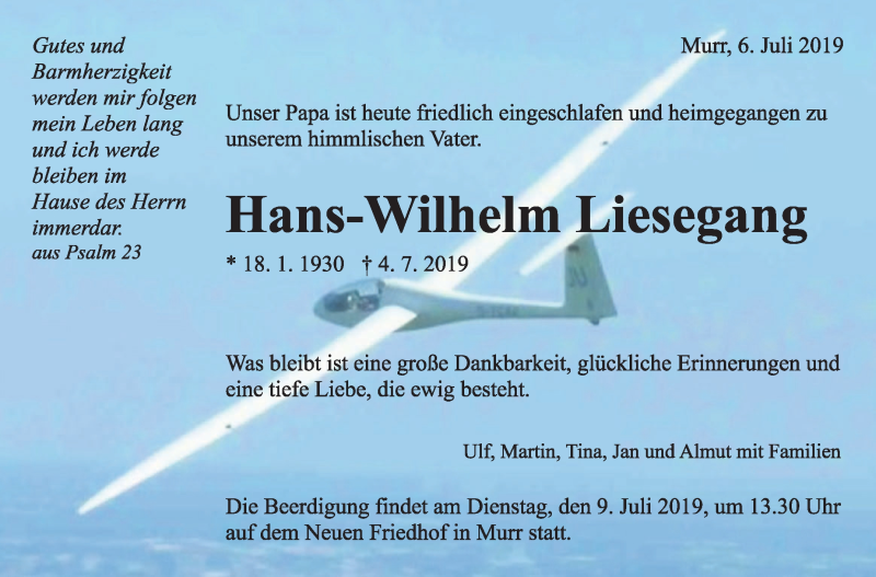 Hier finden Sie alle Traueranzeigen aus der Zeitung, die bisher für Hans-Wilhelm Liesegang erschienen sind. Weitere Traueranzeigen, die in der Zeitung erscheinen, werden hier ebenfalls aufgelistet