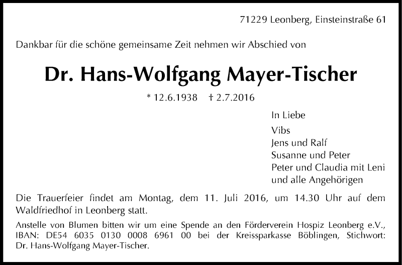 Hier finden Sie alle Traueranzeigen aus der Zeitung, die bisher für Hans-Wolfgang Mayer-Tischer erschienen sind. Weitere Traueranzeigen, die in der Zeitung erscheinen, werden hier ebenfalls aufgelistet