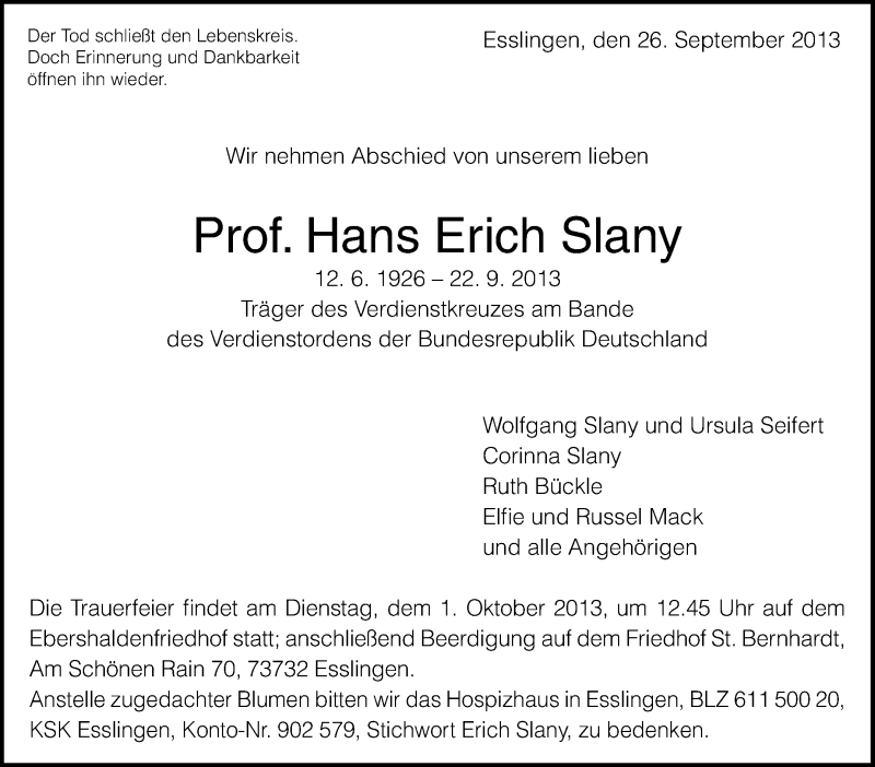 Hier finden Sie alle Traueranzeigen aus der Zeitung, die bisher für Hans Erich Slany erschienen sind. Weitere Traueranzeigen, die in der Zeitung erscheinen, werden hier ebenfalls aufgelistet