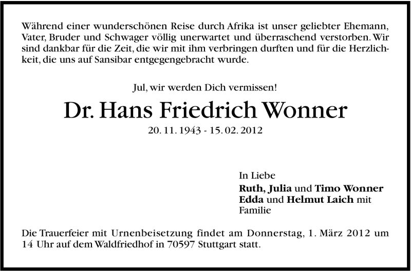 Hier finden Sie alle Traueranzeigen aus der Zeitung, die bisher für Hans Friedrich Wonner erschienen sind. Weitere Traueranzeigen, die in der Zeitung erscheinen, werden hier ebenfalls aufgelistet