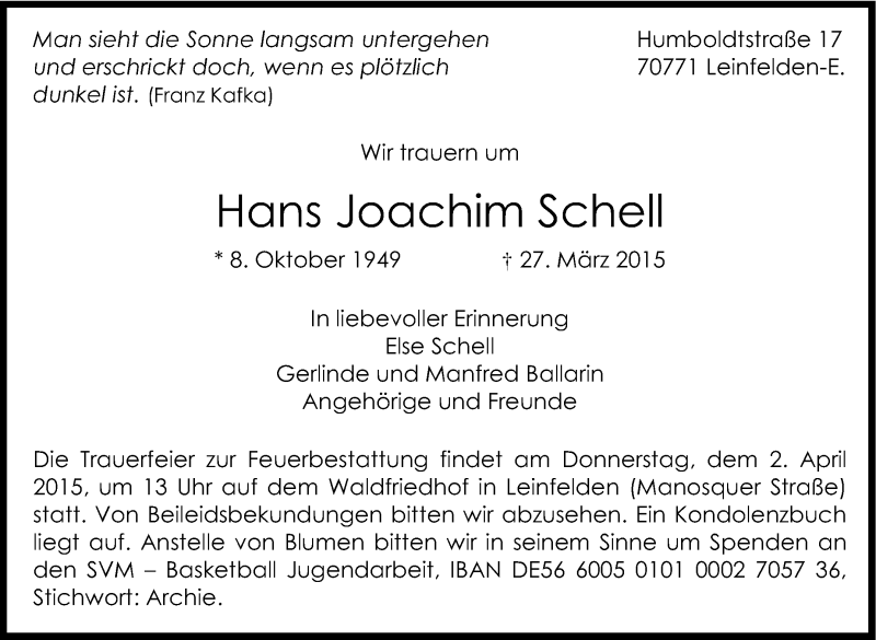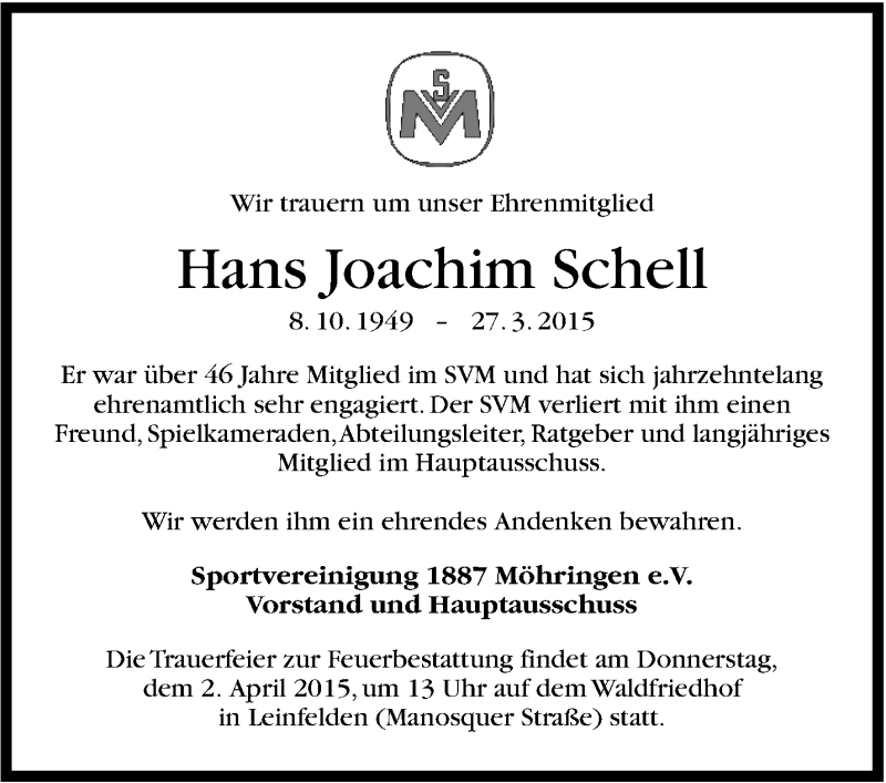 Hier finden Sie alle Traueranzeigen aus der Zeitung, die bisher für Hans Joachim Schell erschienen sind. Weitere Traueranzeigen, die in der Zeitung erscheinen, werden hier ebenfalls aufgelistet