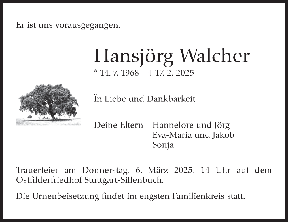 Hier finden Sie alle Traueranzeigen aus der Zeitung, die bisher für Hansjörg Walcher erschienen sind. Weitere Traueranzeigen, die in der Zeitung erscheinen, werden hier ebenfalls aufgelistet