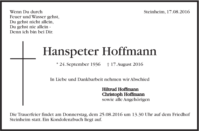 Hier finden Sie alle Traueranzeigen aus der Zeitung, die bisher für Hanspeter Hoffmann erschienen sind. Weitere Traueranzeigen, die in der Zeitung erscheinen, werden hier ebenfalls aufgelistet