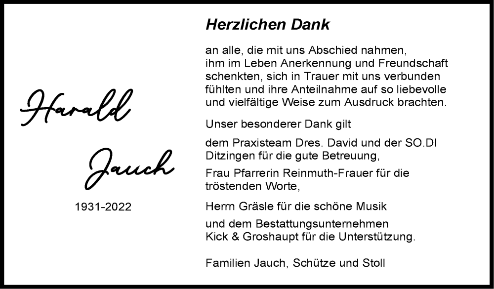 Hier finden Sie alle Traueranzeigen aus der Zeitung, die bisher für Harald Jauch erschienen sind. Weitere Traueranzeigen, die in der Zeitung erscheinen, werden hier ebenfalls aufgelistet
