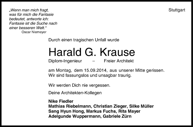 Hier finden Sie alle Traueranzeigen aus der Zeitung, die bisher für Harald Krause erschienen sind. Weitere Traueranzeigen, die in der Zeitung erscheinen, werden hier ebenfalls aufgelistet