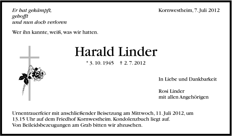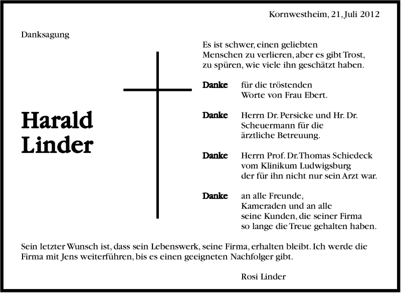 Hier finden Sie alle Traueranzeigen aus der Zeitung, die bisher für Harald Linder erschienen sind. Weitere Traueranzeigen, die in der Zeitung erscheinen, werden hier ebenfalls aufgelistet