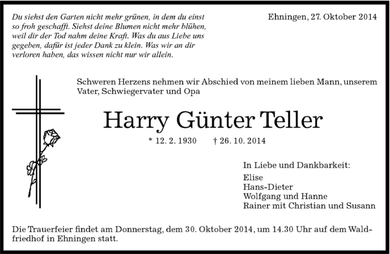 Hier finden Sie alle Traueranzeigen aus der Zeitung, die bisher für Harry Günter Teller erschienen sind. Weitere Traueranzeigen, die in der Zeitung erscheinen, werden hier ebenfalls aufgelistet