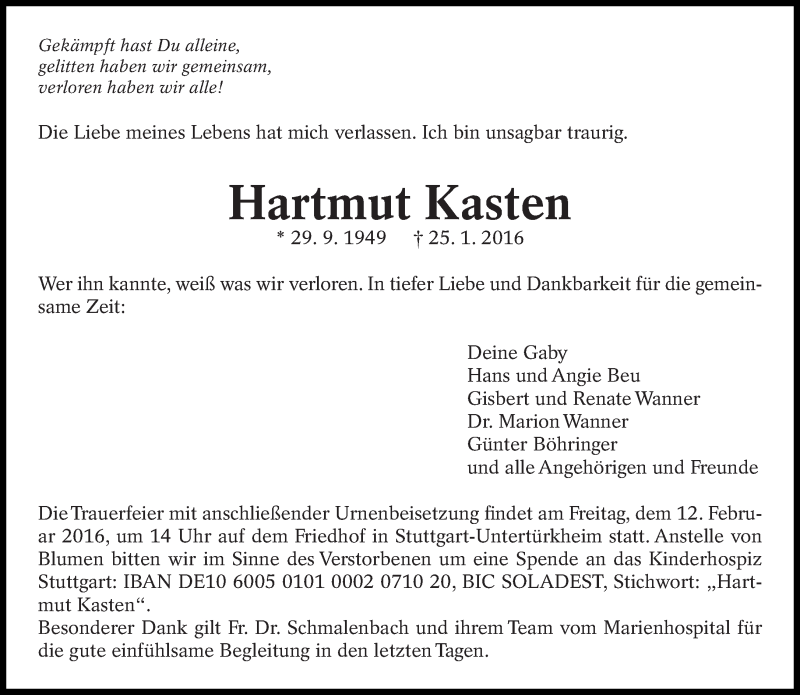 Hier finden Sie alle Traueranzeigen aus der Zeitung, die bisher für Hartmut Kasten erschienen sind. Weitere Traueranzeigen, die in der Zeitung erscheinen, werden hier ebenfalls aufgelistet