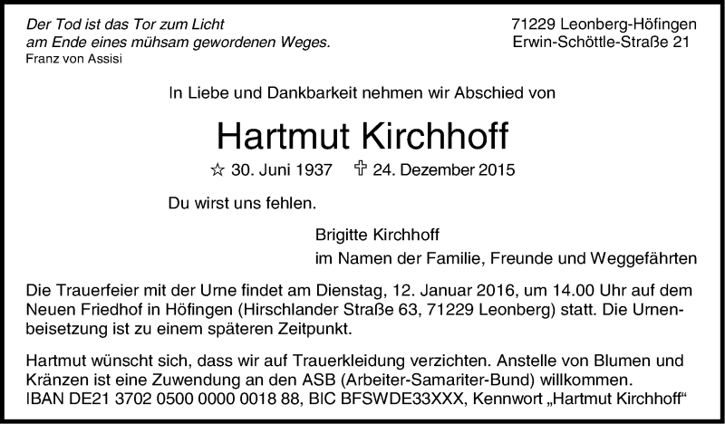 Hier finden Sie alle Traueranzeigen aus der Zeitung, die bisher für Hartmut Kirchhoff erschienen sind. Weitere Traueranzeigen, die in der Zeitung erscheinen, werden hier ebenfalls aufgelistet